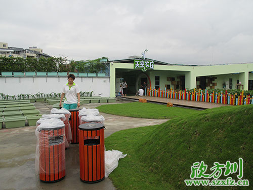 深圳天空農莊是中國首家以有機農業為主題的兒童體驗樂園,以“給孩子一個綠色的童年”為核心,以有機農業為依托,以體驗式教育理論為基礎,專為3-15歲兒童打造的多功能主題樂園!天空農莊采購部為利于環保,提升環境形象,創建和諧的自然環境,特意聯系我司欣方圳訂購了一批鋼木垃圾桶。