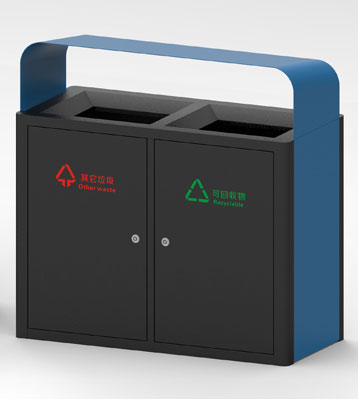 桶頭高低傾斜設計美觀大方,桶身采用黑色烤漆工藝,桶框采用藍色烤漆工藝,斜切投口垃圾投放更徹底,絲印垃圾分類標識從源頭規范垃圾分類精準投放。