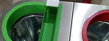 機場精品不銹鋼垃圾桶桶身邊緣圓角防撞設計,避免高人流時不經意的磕碰對人身造成傷害,投口顏色分類,垃圾投放更合理。