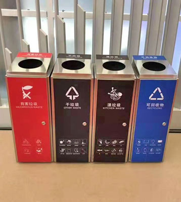 • 產品材質:室內不銹鋼干濕四分類垃圾桶采用201#不銹鋼足0.8mm厚度外筒,鋅板內筒0.4mm,貼戶外噴繪高檔美觀,可按不同地區垃圾分類要求,絲印可回收物(RECYCLABLE WASTE)、有害垃圾(HAZARDOUS WASTE)、濕垃圾(HOUSEHOLD FOOD WASTE)、干垃圾(RESIDUAL WASTE)等分類標。