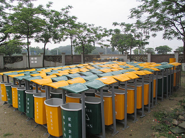 玻璃鋼垃圾桶桶身和內膽部分,采用高級玻璃鋼材質一次成型,經過打磨、除塵 、噴漆等一系列后期工藝然后出成品。