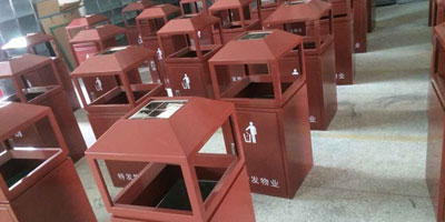 • 產品材質:欣方圳戶外環保鋼制垃圾桶采用優質冷軋鋼材料經剪鈑下料、折彎、沖壓、焊接、打磨、等工藝:表面經過除油、噴砂防銹處理后,再進行酸洗磷化處理;表面清理干燥后整體進行靜電噴涂或烤漆處理,靜電噴涂是經過流水線高溫固化爐固化后再出爐冷卻,加工后的塑粉附著力強,不易剝落;