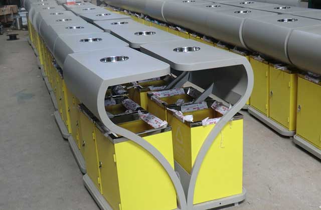 • 產品材質:欣方圳戶外分類垃圾桶采用優質冷軋鋼材料經剪鈑下料、折彎、沖壓、焊接、打磨、等工藝:表面經過除油、噴砂防銹處理后,再進行酸洗磷化處理;表面清理干燥后整體進行靜電噴涂或烤漆處理,靜電噴涂是經過流水線高溫固化爐固化后再出爐冷卻,加工后的塑粉附著力強,不易剝落;